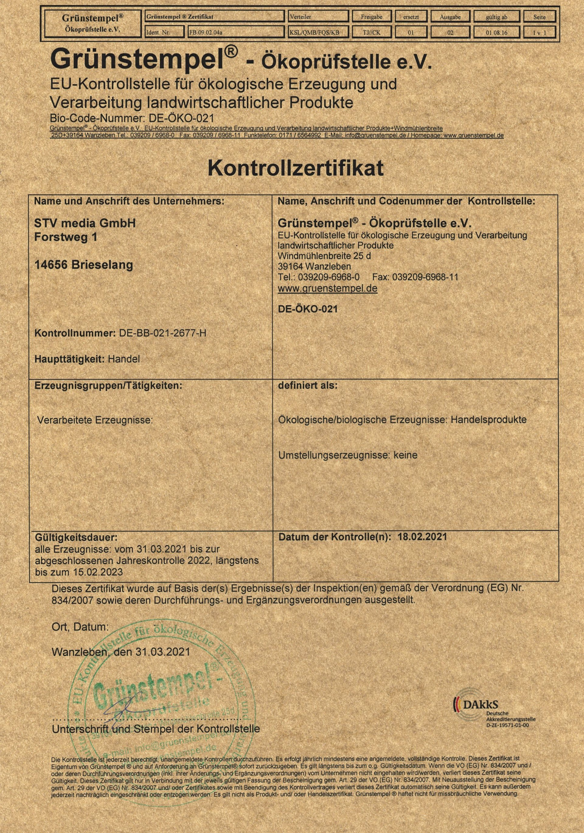 Unser Unternehmen wurde von der durch die Bundesanstalt für Landwirtschaft und Ernährung bundesweit zugelassene Öko- Kontrollstelle Grünstempel® zertifiziert. Unseren Kundinnen und Kunden wird damit versichert, dass alle Mitarbeitenden der STV media GmbH geschult sind, Ware in Bio-Qualität entsprechend zu behandeln und die strikte Trennung von ökologischer und konventioneller Ware einzuhalten. Es wird sichergestellt, dass Wareneingang, Warenausgang und Lagerhaltung nach der Verordnung durchgeführt werden. Eine erneute Prüfung und Zertifizierung werden jährlich durchgeführt.